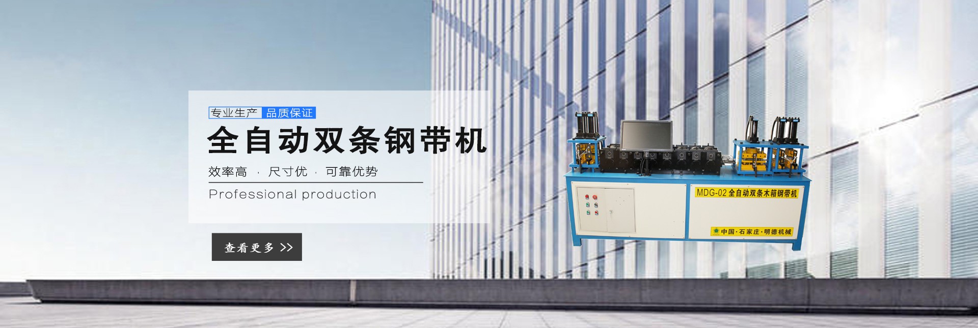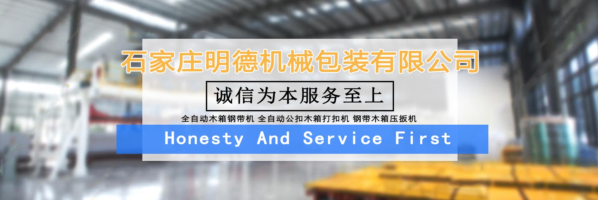 石家莊明德包裝機械有限公司是國內專業(yè)生產木全自動木箱鋼帶機、半自動公母扣木箱打扣機、全自動雙排孔定長切斷機、美式托盤打釘機械、托盤刨槽機、倒角機、木包裝箱、木托盤的生產廠家。